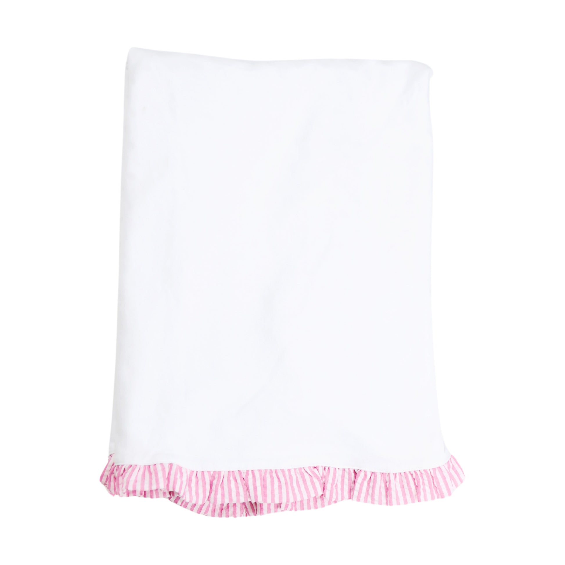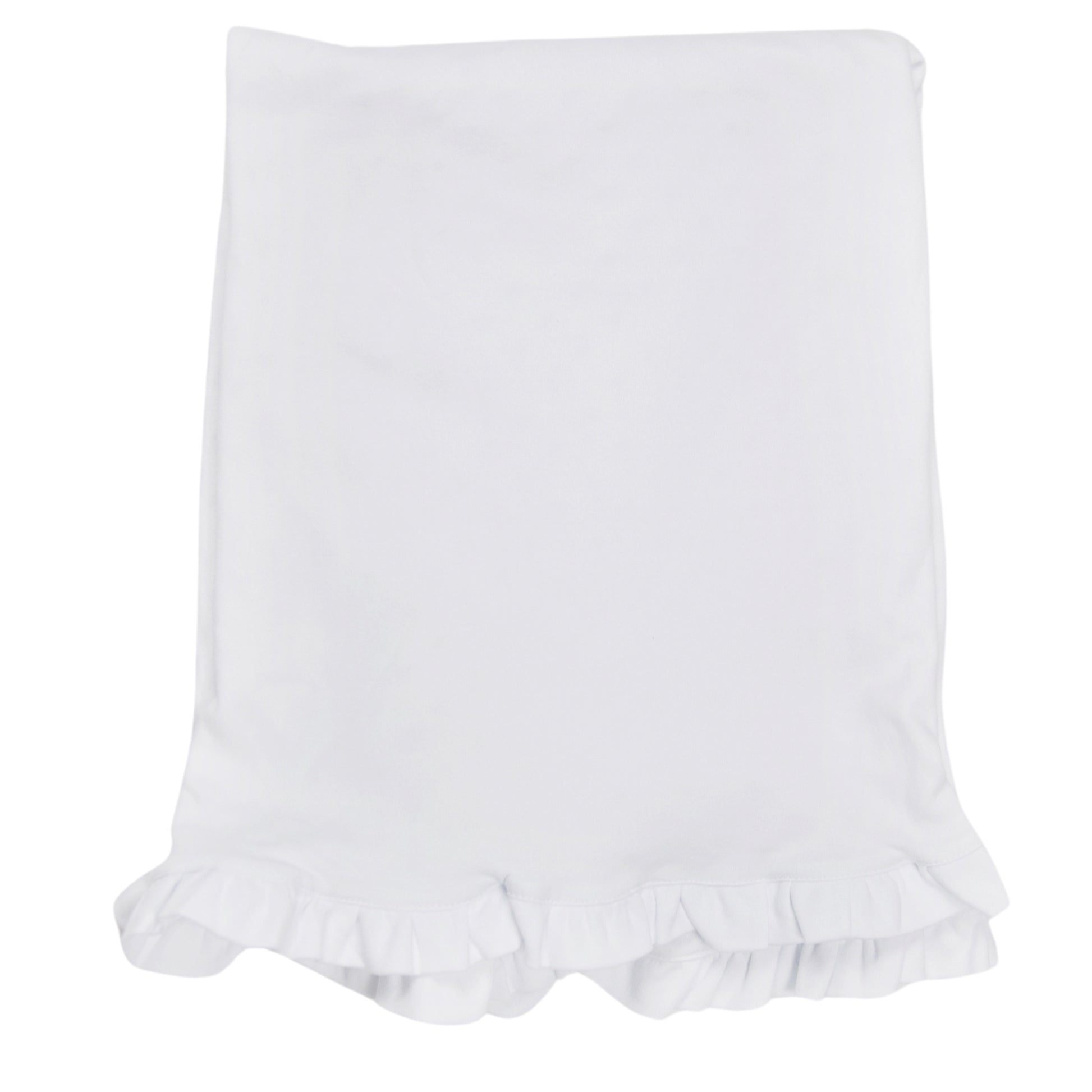 Wrap your little one in luxury with our baby blanket with a ruffle. This 30x30 inch blanket features a soft and cozy white minky dot on one side and a bright white 100% interlock cotton on the other. The charming white cotton ruffle trim adds an adorable touch. Perfect for babies and toddlers, this blanket is versatile and comfortable. Personalize it with embroidery for a special touch. Shop now and sign up for a wholesale account at Love That Cotton if you're a business. Give your baby the ultimate snuggle with this beautiful baby blanket.