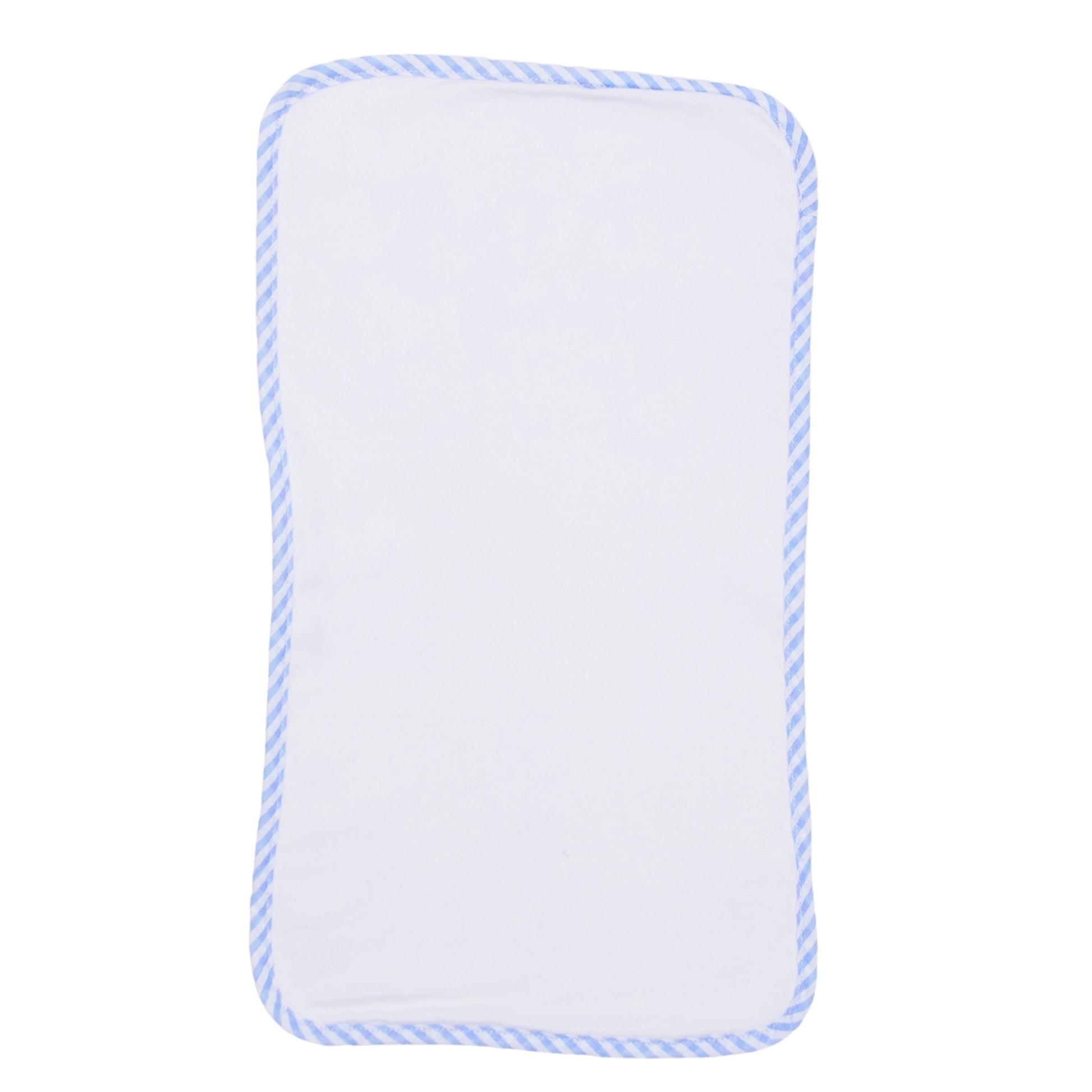 Introducing our burp cloth, a must-have accessory for every parent. Made from 100 percent interlock cotton on the front and terry cloth cotton on the back, it offers superior absorbency. The cloth is beautifully trimmed with a 100 percent cotton piping and top stitch detail. With a generous size of 10x18 inches, it provides ample coverage. Personalize it with embroidery for a special touch. Explore our collection of kids clothing and baby gifts. Sign up for a wholesale account at Love That Cotton today!