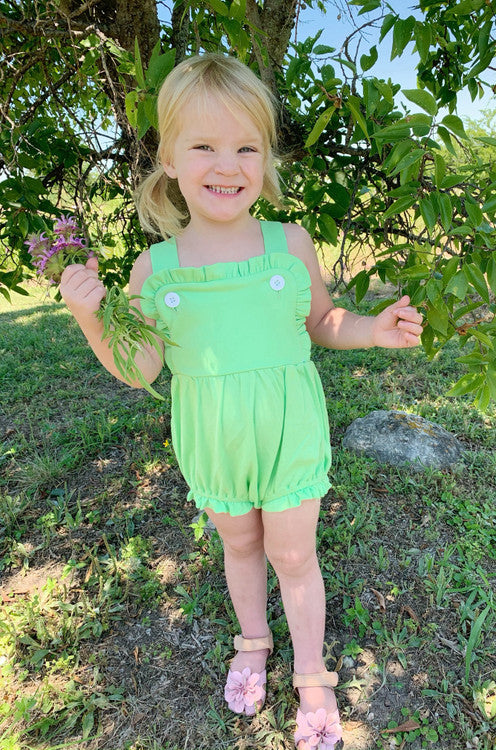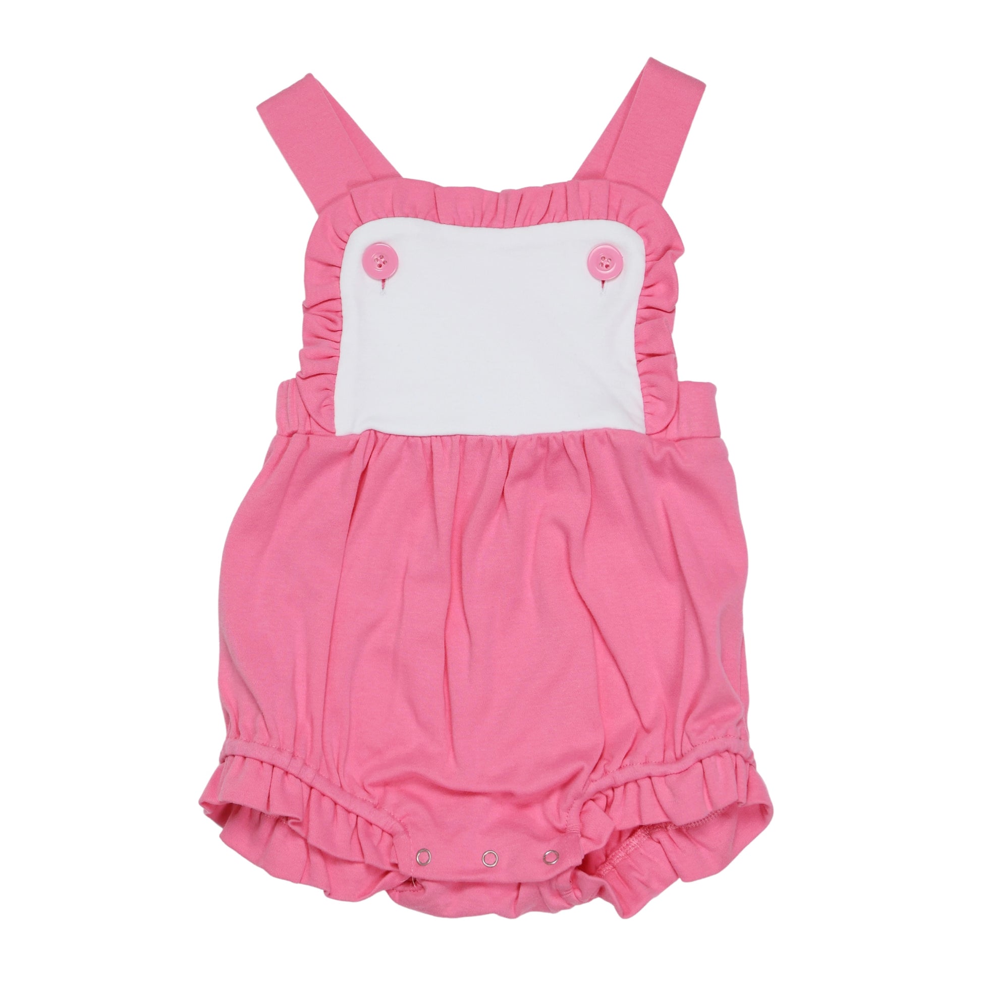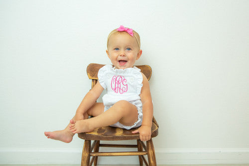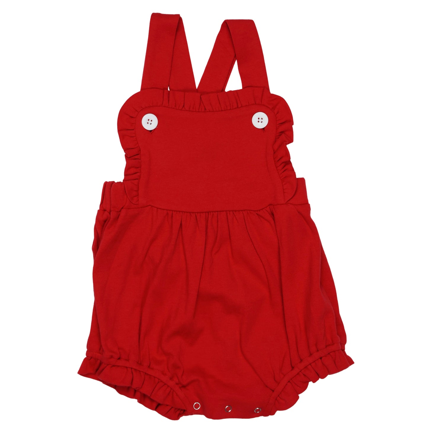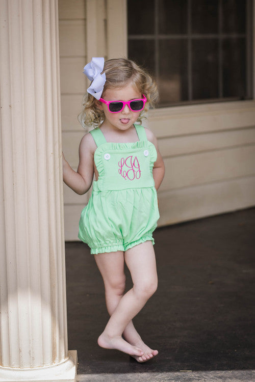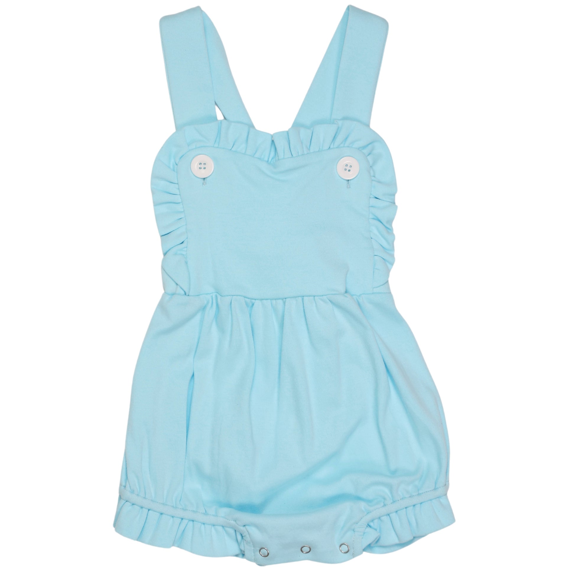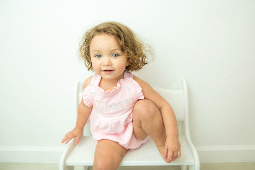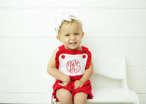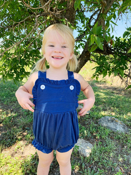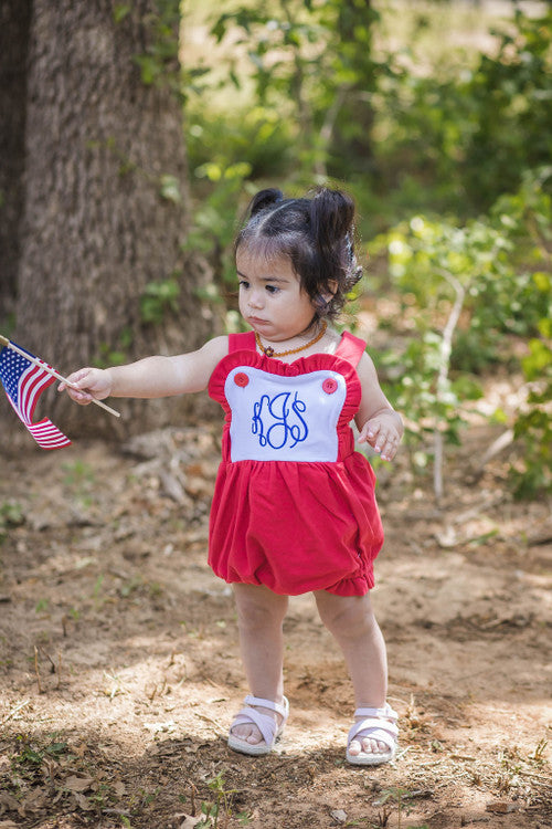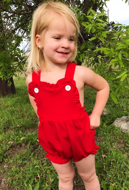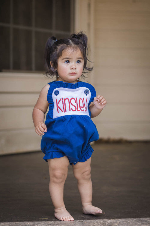 Our girls knit sunsuit is SOOOO CUTE, and the ruffles make it perfect for every occasion . It snaps at the crotch and buttons on the shoulder straps. It also has elastic in the leg openings. It would be super cute for 4th of July, Easter and other summer / spring gatherings. Remember that we offer embroidery on all of our kids clothing and baby gifts. Are you a business? Please sign up for a wholesale account.