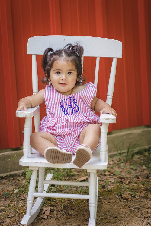Get ready for warmer days with our girls seersucker romper. Made from 100% cotton, this romper is both stylish and comfortable. It features a ruffle detail and is available in a variety of colors. The romper is fully lined and has a convenient snap closure at the crotch for easy diaper changes. The single button on the straps adds a cute and functional touch. Don't forget, we offer embroidery on all our kids clothing and baby gifts. Sign up for a wholesale account at Love That Cotton to discover more options!