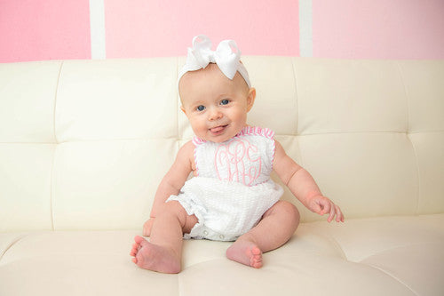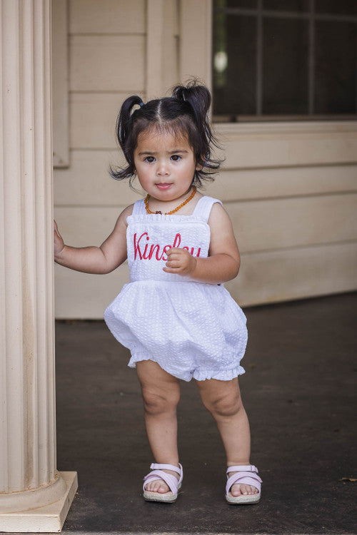 Our sun bubble available in several colors. It is fully lined, with snaps at the crotch and the shoulder straps tie in a bow. It also has elastic in the leg openings. It would be super cute for easter, 4th of July, and other summer gatherings. Remember that we offer embroidery on all of our kids clothing and baby gifts. Are you a business? Please sign up for a wholesale account.
