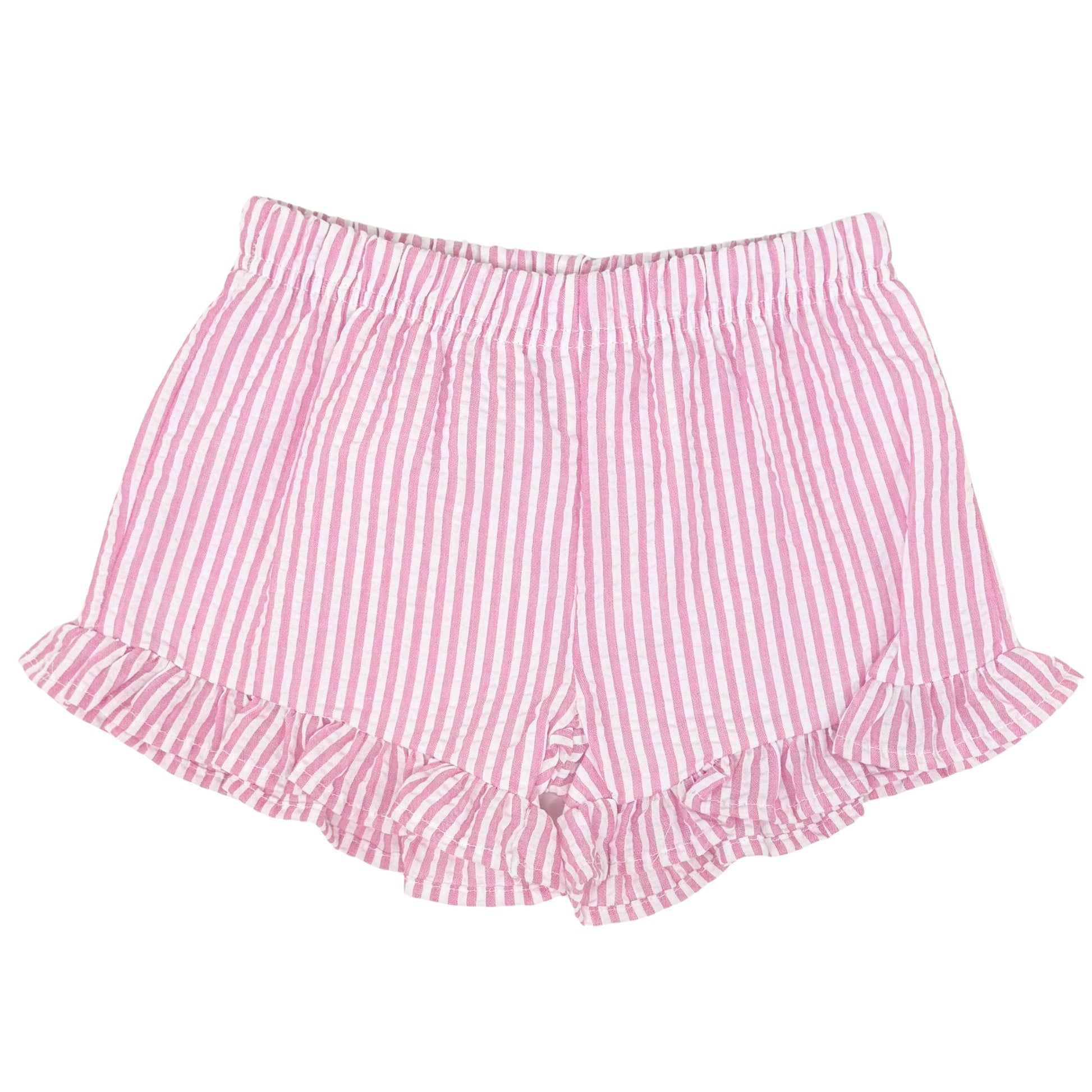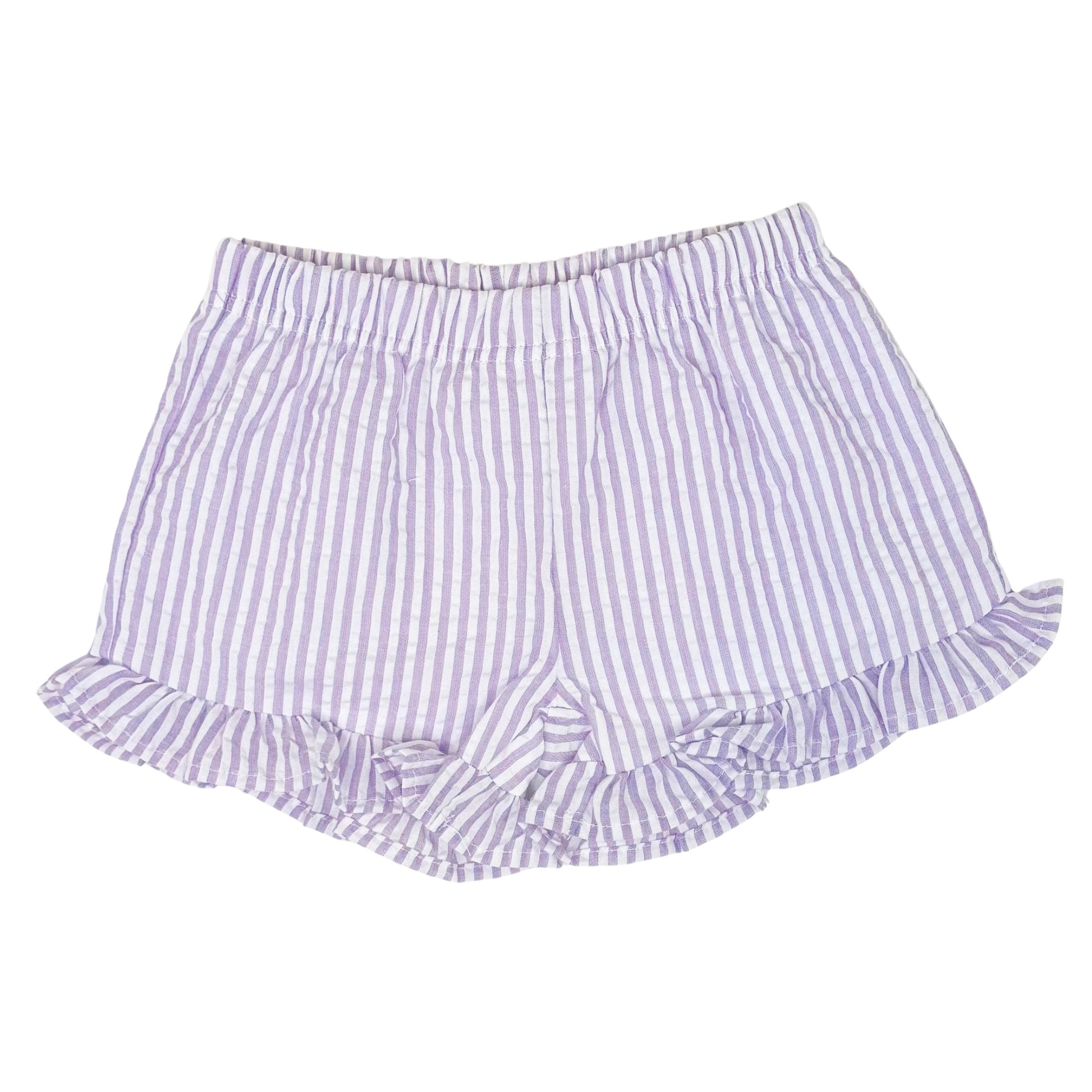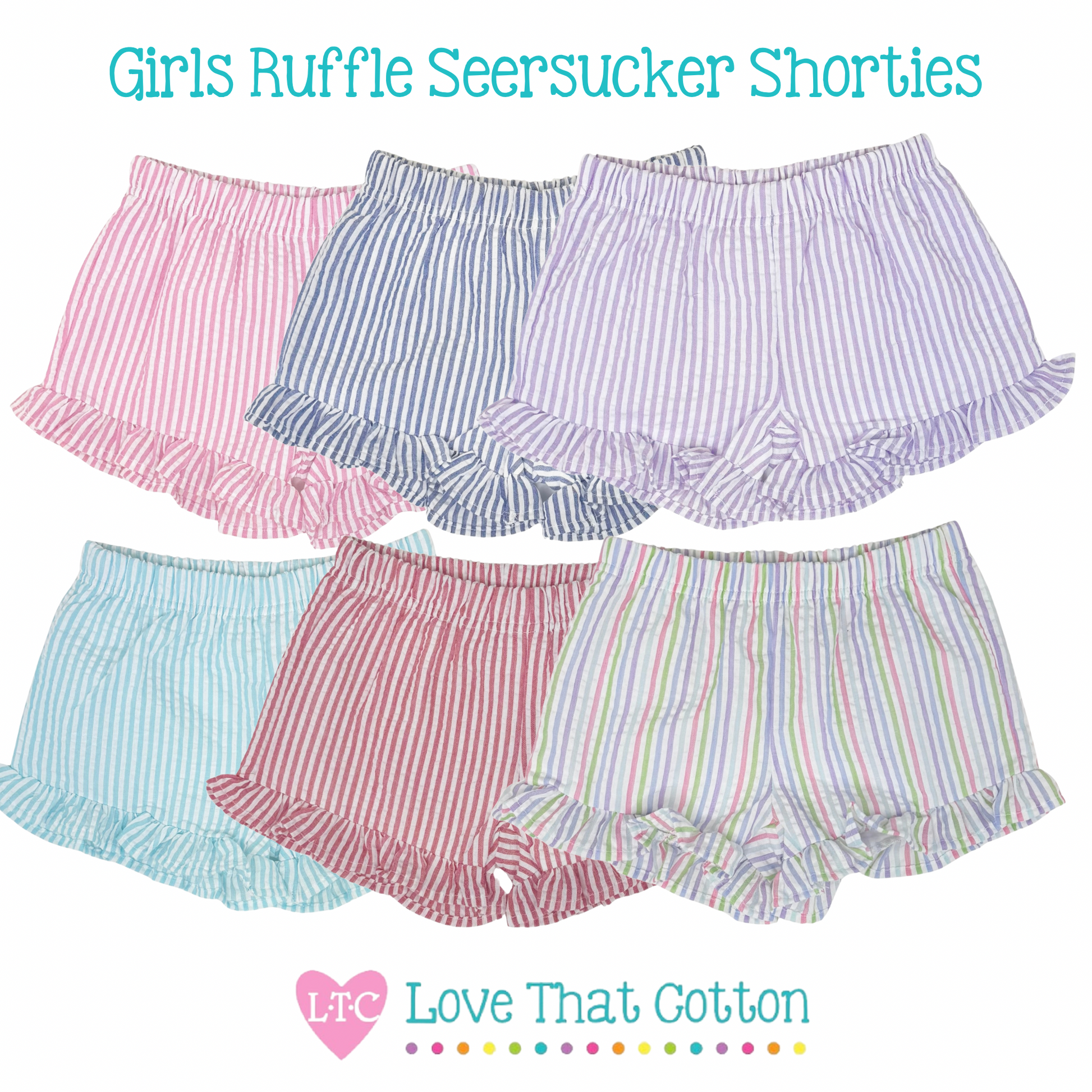 Dress your little girl in style and comfort with our girls' ruffled seersucker shorties. Made from 100% cotton, these shorties feature a fully lined design for added comfort. The elastic waist ensures a perfect fit, while the double stitching along the hem adds durability. Let your little one play and explore with ease in these adorable, ruffled seersucker shorties. Explore our collection at Love That Cotton and discover the perfect summer outfit. Wholesale accounts available.