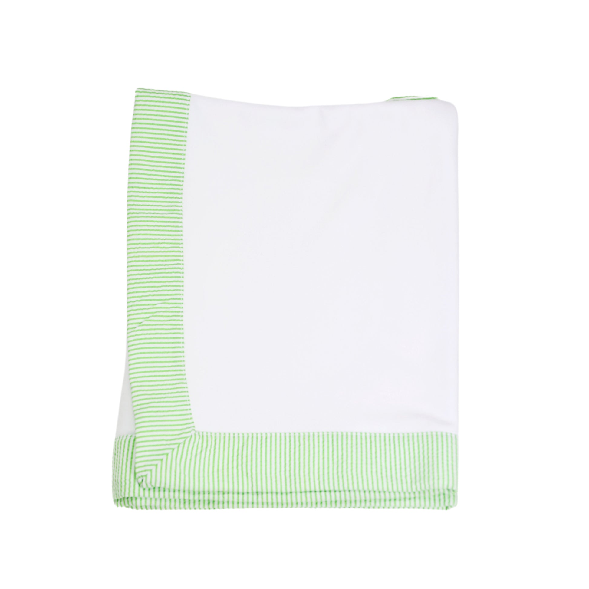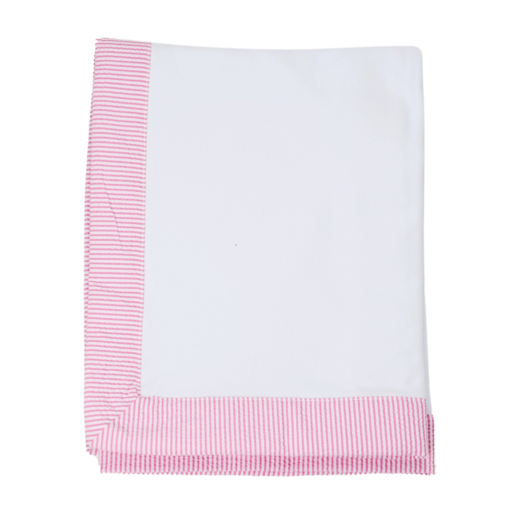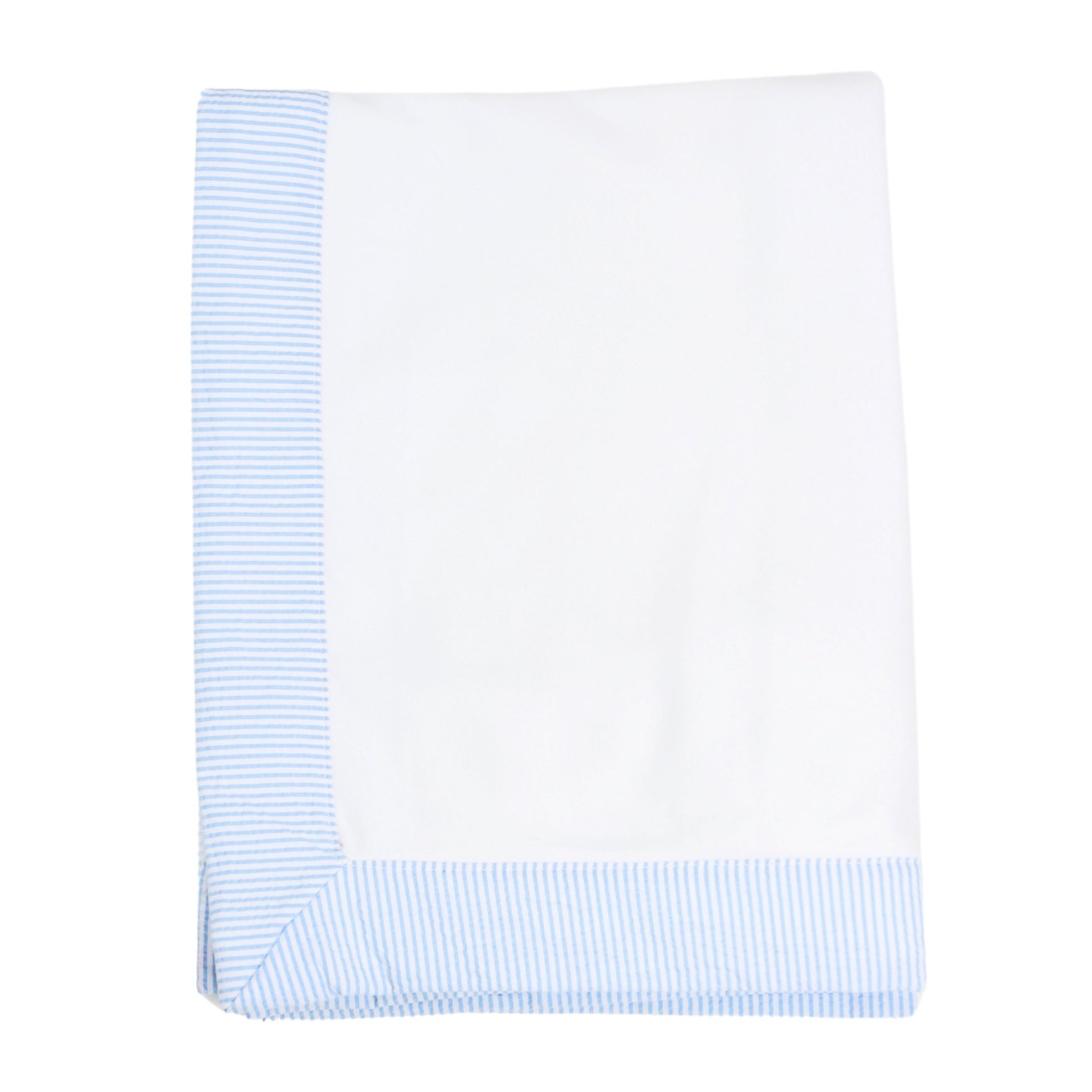 Our Miller Collection baby blanket is made of white 100 percent cotton on the other. It is trimmed in a nice seersucker trim. The 31x 20 size makes it perfect for baby, but big enough for a toddler and beyond. Remember that we offer embroidery on all of our kids clothing and baby gifts. Are you a business? Please sign up for a wholesale account.