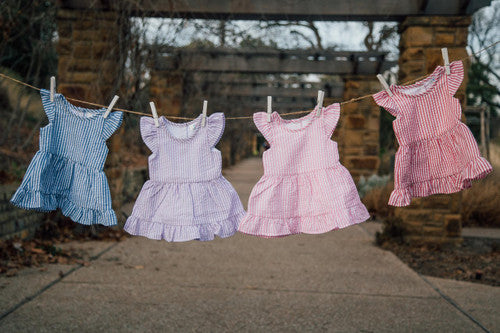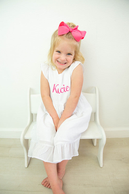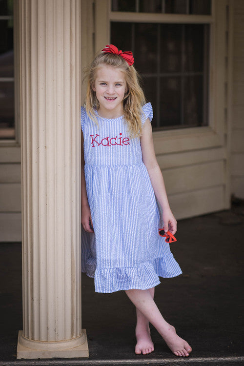 Explore our delightful girls' seersucker dress, perfect for any occasion. Crafted from 100% cotton, this dress offers breathability and comfort. It is fully lined for added quality and durability. The dress features a charming flutter sleeve and a ruffle along the bottom, adding a touch of playfulness. With its empire waist and button closure in the back, it offers a stylish and comfortable fit. Complete your little one's outfit with our embroidery options, available on all our kids' clothing and baby gifts. Sign up for a wholesale account at Love That Cotton to discover more!