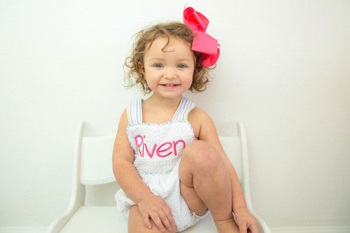 Our sun bubble available in several colors. It is fully lined, with snaps at the crotch and the shoulder straps have a series of button holes making the straps adjustable. You can also choose if you would like to cross the straps or wear them straight. The bubble has elastic in the leg openings. It would be super cute for Easter, 4th of July, and other summer gatherings. Remember that we offer embroidery on all of our kids clothing and baby gifts. Are you a business? Please sign up for a wholesale account.
