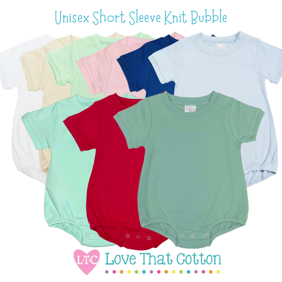 Experience ultimate comfort with our unisex knit short sleeve bubble. Made with 100% cotton, this bubble offers a soft and stretchy fit. Elastic around the legs ensures a secure and comfortable fit. With snaps in the crotch for easy diaper changes, this 5.5 oz bubble combines convenience and style. Available in a variety of colors, you'll want to have one in every shade. Personalize it with embroidery for a unique touch. If you're a business, sign up for a wholesale account at Love That Cotton. Shop now and embrace comfort and style with our unisex knit bubble.